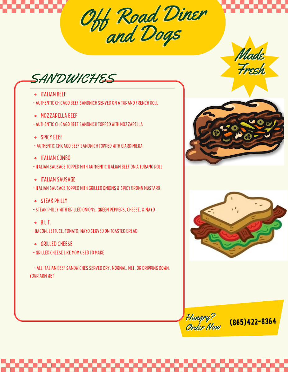 Located in Oak Ridge, TN, Off Road Diner and Dogs is the ultimate destination for hot dog aficionados and comfort food connoisseurs alike. The menu boasts a delightful array of hot dogs, with highlights including the classic Chicago Dog, which comes piled high with all the traditional fixings, and the Texas Dog, adorned with chili, cheese, and jalapeños for those craving a kick.